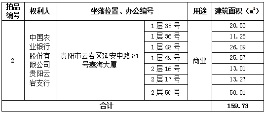 2、貴陽市云巖區(qū)延安中路81號鑫海大廈1層35、36、48、49號及2層16、17、50號商業(yè)房地產(chǎn)(總建筑面積:159.73㎡)。