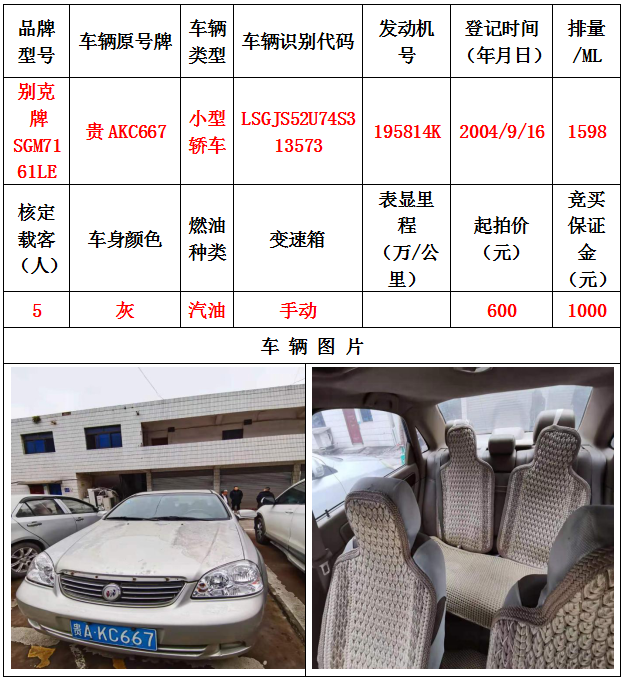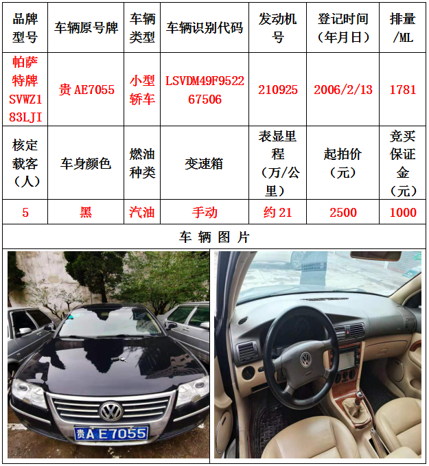 本次拍賣會拍賣的車輛共計10輛車,分別為帕薩特牌SVWZ183LJI小型轎車一輛、匯眾牌SH6530中型普通客車一輛、別克牌SGM6517小型普通客車一輛、別克牌SGM7161LE小型轎車一輛、寶來牌BORA1.6小型轎車一輛、捷達牌FV7160GiFE3小型轎車五輛(詳情見下文),為打包整體拍賣,不作拆分,整體起拍價:33900元,且只對標的現(xiàn)狀進行拍賣,不作任何質量擔保。