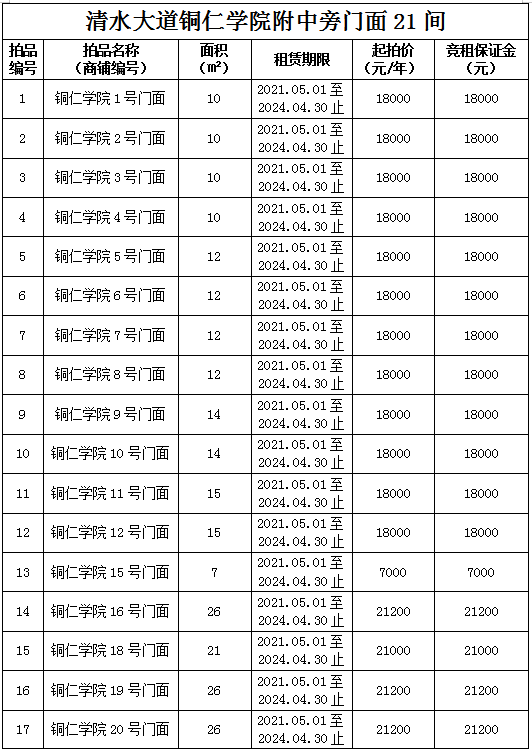 1.拍品1至21號標(biāo)的位于銅仁市清水大道銅仁學(xué)院附中旁,面積7——28㎡,租賃期3年(2021.05.01至2024.04.30止),交通便利,人流量大。