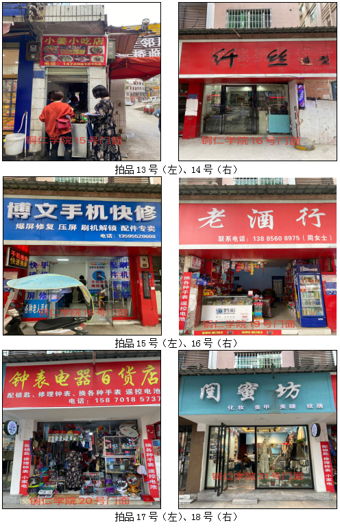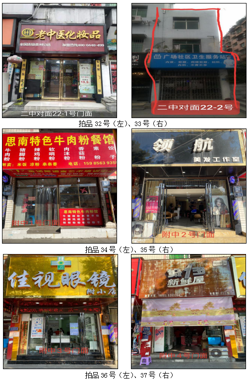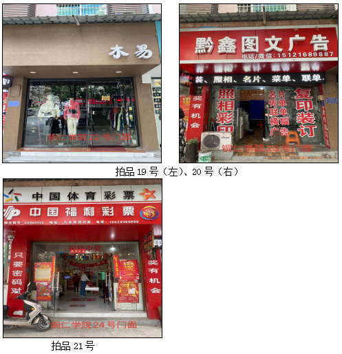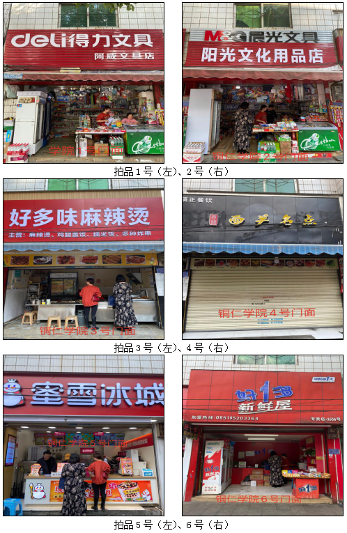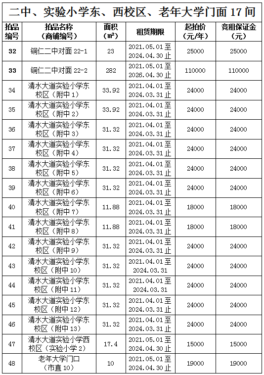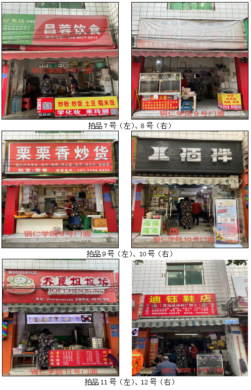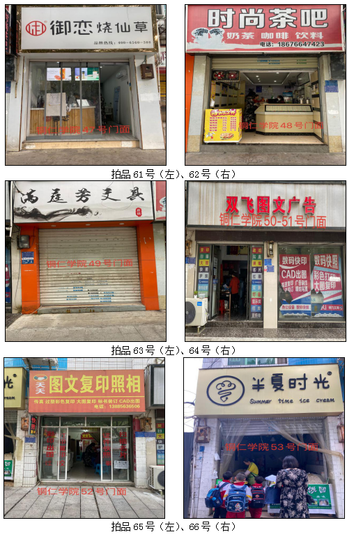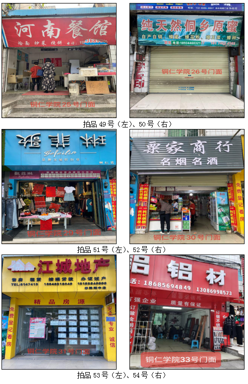 拍品34至46號標(biāo)的位于銅仁市清水大道實(shí)驗小學(xué)東校區(qū),面積11.88——33.92㎡,租賃期3年(2021.04.01至2024.03.31止);