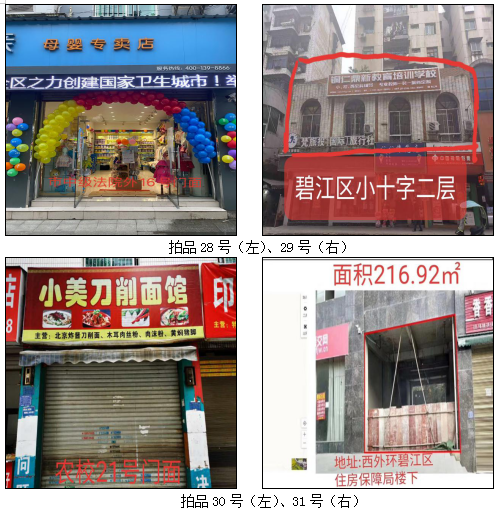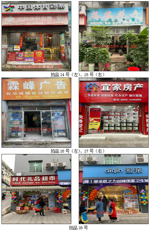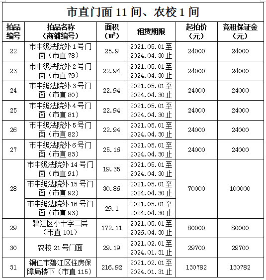 1.拍品22至28號標(biāo)的位于銅仁市中級人民法院外,面積:19.35——30.86㎡,租賃期3年(2021.05.01至2024.04.30止),交通便利,其中28號標(biāo)的包含3個門面(市直91號、92號和93號)為整體拍租。