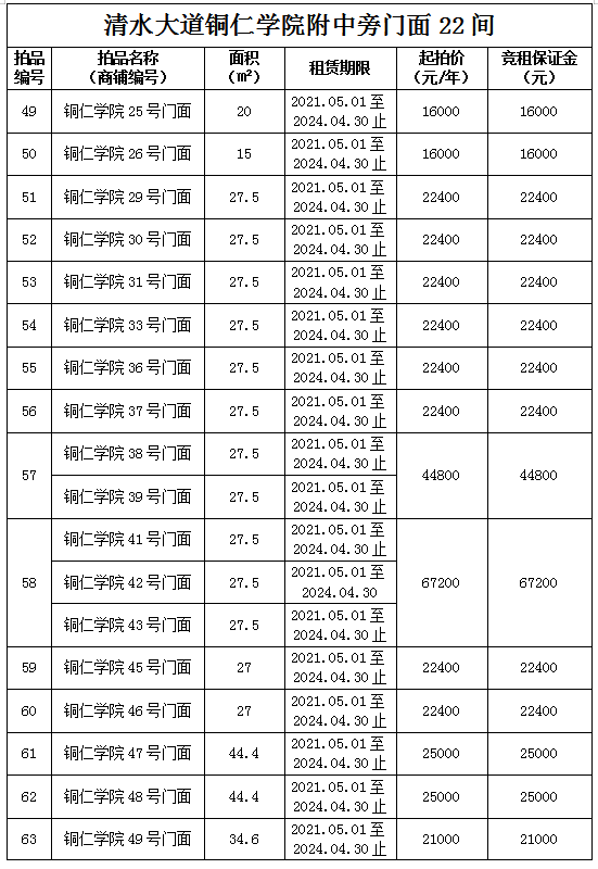 1.拍品49至66號標(biāo)的位于銅仁市清水大道銅仁學(xué)院附中旁,面積15——44.4㎡,租賃期3年(2021.05.01至2024.04.30止),交通便利,人流量大。