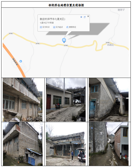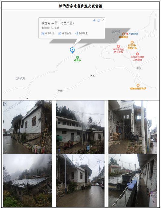 標的位于畢節(jié)市七星關區(qū)亮巖鎮(zhèn)亮巖村,房屋總層數(shù)二層,建成于1994年??偨ㄖ娣e:1405.64㎡,其中套內(nèi)建筑面積:1291.06㎡,共有分攤面積:114.58㎡;土地面積:964.29㎡,磚混結構,無房產(chǎn)證,國有土地使用證:畢市國用(95)字第22-004號,用途為:倉庫,土地性質(zhì)為:劃撥用地。