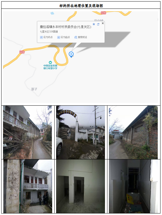 標的位于畢節(jié)市七星關區(qū)撒拉溪鎮(zhèn)永豐村,房屋總層數(shù)二層,建成于1990年??偨ㄖ娣e:379.44㎡,其中套內(nèi)建筑面積:299.55㎡,共有分攤面積:79.89㎡;土地面積:416.15㎡,磚混結構,無房產(chǎn)證,國有土地使用證:畢市國用(95)字第15-036號,用途為:倉庫,土地性質(zhì)為:劃撥用地。