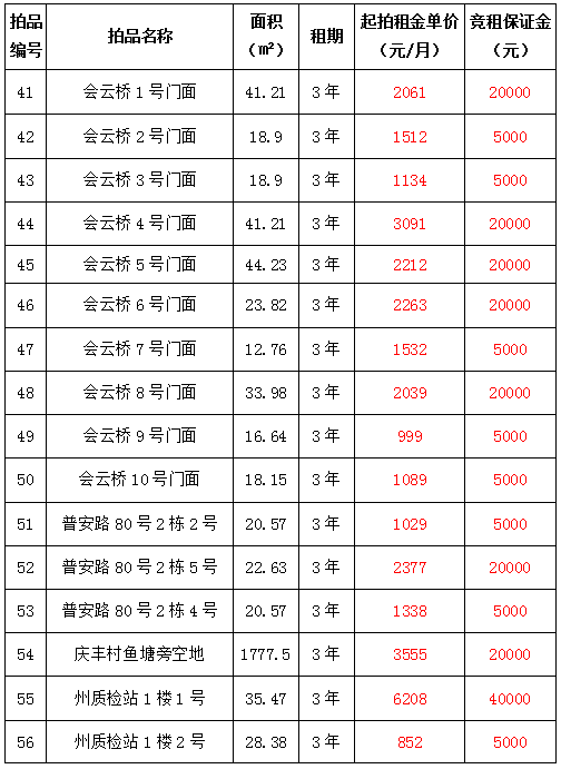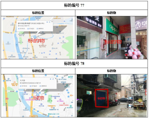 2021年1月28日下午14:00拍賣標(biāo)的共計38個標(biāo)的,其中:41—72號標(biāo)的目前均為租賃狀態(tài),如承租人參與競租,其享有同等價位優(yōu)先購買權(quán),其余73—78標(biāo)的為閑置狀態(tài)。