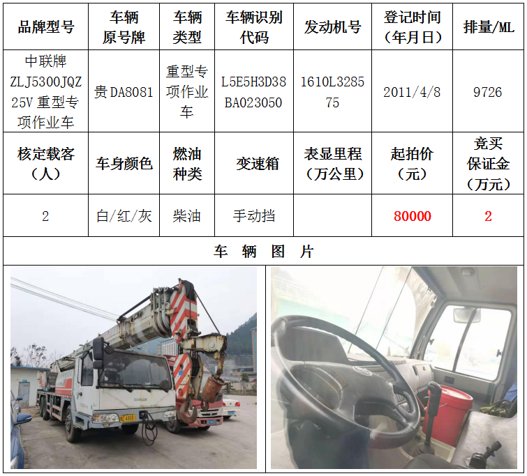 1、中聯(lián)牌重型專項(xiàng)作業(yè)車一輛,起拍價(jià):80000元,競(jìng)買保證金:2萬元;