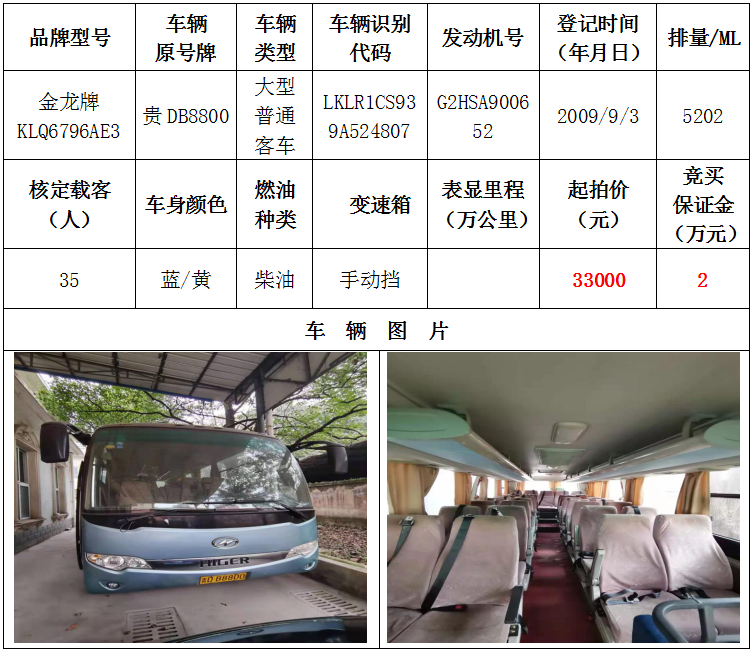 2、金龍牌大型普通客車一輛,起拍價(jià):33000元,競(jìng)買保證金:2萬元;