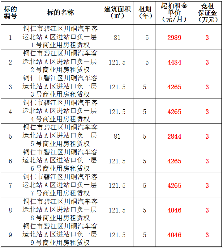 3、銅仁市碧江區(qū)川硐汽車客運(yùn)北站A區(qū)進(jìn)站口負(fù)一層3號(hào)門面租賃權(quán),面積:121.5㎡,租賃期:5年,起拍租金單價(jià):4265元/月,競(jìng)租保證金:3萬(wàn)元;