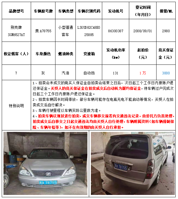 別克牌SGM6527AT小型普通客車1輛,起拍價(jià)1萬元。