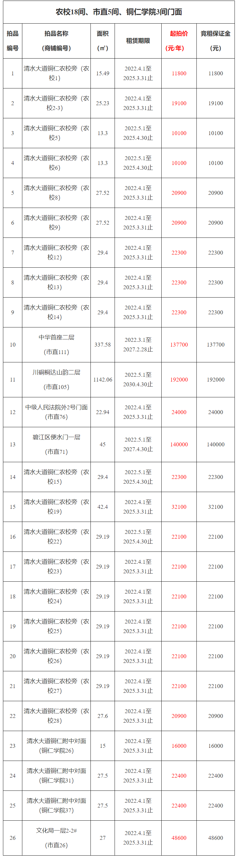 20、清水大道銅仁農(nóng)校旁(商鋪編號:農(nóng)校26),面積:29.19㎡,租賃期:3年,起拍價:22100元/年,競租保證金:22100元;