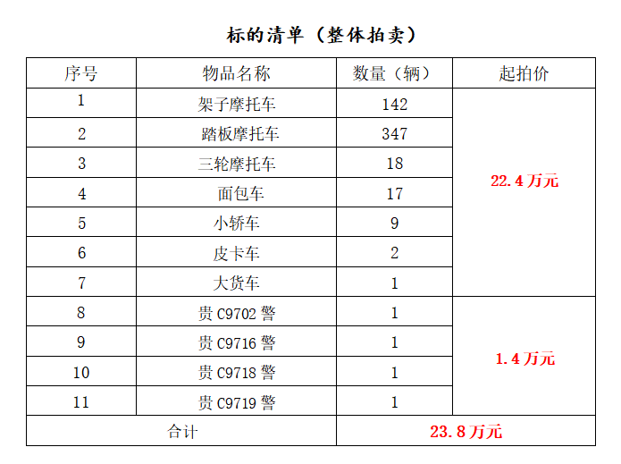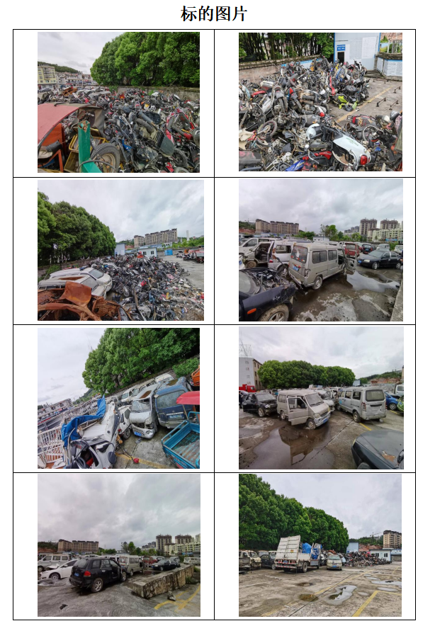 該批標(biāo)的為整體拍賣,包括架子摩托車、踏板摩托車、三輪摩托車、面包車、小轎車、皮卡車、大貨車一批(均作為報(bào)廢物資整體拍賣)。