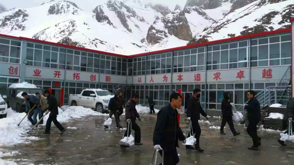 2016年3月21日青海共和縣青海銅鑫礦業(yè)有限公司礦區(qū)迎來了自春節(jié)以來的第一場(chǎng)大雪,前幾這里還太陽高照,天氣晴朗,與此同時(shí)洛陽陽光明媚,鳥語花香,現(xiàn)在青海銅鑫礦區(qū)則被厚厚的白雪覆蓋,呈現(xiàn)出另一番別樣的景像。青海分公司員工也一起參加礦山工作區(qū)的除雪工作,個(gè)個(gè)干得熱火朝天,一會(huì)兒大院里的雪就被清理完畢。