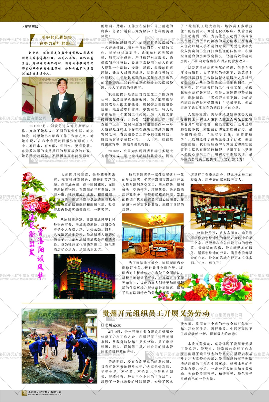 洛陽開元礦業(yè)集團(tuán)有限公司簡介洛陽開元礦業(yè)集團(tuán)有限公司,始成立于2006年,位于洛陽市開元大道269號。集團(tuán)旗下共有五余家全資子公司,業(yè)務(wù)涉及有色金屬礦山開發(fā)、礦產(chǎn)品購銷與進(jìn)出口貿(mào)易、房地產(chǎn)開發(fā)、文化藝術(shù)、企業(yè)管理與咨詢、資本投資等多個領(lǐng)域。民建河南省委委員、民建河南省委企業(yè)委副主任、民建洛陽市委委員、企業(yè)委主任、洛陽民建企業(yè)家協(xié)會會長許明月是公司創(chuàng)始人,現(xiàn)任洛陽開元礦業(yè)集團(tuán)有限公司董事長。在礦業(yè)領(lǐng)域,洛陽開元礦業(yè)集團(tuán)擁有多家實力雄厚的子公司:貴州開元礦業(yè)有限公司探、采礦權(quán)面積共11.33平方公里;興??h銅鑫礦業(yè)有限公司探礦權(quán)面積8.76平方公里,礦山資源潛力巨大;2021年,開元集團(tuán)與盧氏中科礦業(yè)有限公司開展戰(zhàn)略合作。盧氏中科礦業(yè)有限公司專注于有色金屬的浮選、加工和銷售,擁有強(qiáng)大的技術(shù)支撐平臺,是集探、采、選、冶、研為一體的中大型綜合礦業(yè)企業(yè)。目前,盧氏中科王家河1000噸選礦廠已成功投產(chǎn),雙河金礦、柳關(guān)欒盧鉛鋅礦相繼順利開工,樓房銀礦與圪老灣鉛鋅礦的深部探礦重大突破,標(biāo)志著礦山版圖取得重大進(jìn)展,為開元集團(tuán)后續(xù)發(fā)展奠定了堅實基礎(chǔ)。在文化傳媒領(lǐng)域,洛陽市明月美術(shù)館通過豐富多樣的藝術(shù)展覽、學(xué)術(shù)研討和公共教育活動,努力打造一個集展覽、交流、教育、研究為一體的綜合性藝術(shù)平臺。此外,在金融投資領(lǐng)域,開元集團(tuán)旗下的北京明峰資本管理有限公司專注于投資具有高增長潛力的優(yōu)秀企業(yè),特別是高科技、新能源、環(huán)保等新興產(chǎn)業(yè),為客戶提供個性化的資產(chǎn)配置服務(wù)。在做好企業(yè)經(jīng)營的同時,開元集團(tuán)始終不忘企業(yè)的社會責(zé)任和家國情懷,以突出的愛心公益事跡,開展了一系列公益慈善活動:“民建林”公益事業(yè)通過“思源基金”“幫幫公益”線上公益平臺,與眾多愛心人士籌措資金20余萬元;資助541名貧困大學(xué)生共計270余萬元,推進(jìn)“數(shù)字助力——河南AI人才培養(yǎng)”;捐款10萬元,馳援京津冀、黑龍江洪水地質(zhì)災(zāi)害……公司于2017年底被洛陽市慈善總會評為“洛陽慈善風(fēng)云榜——十大愛心集體”。洛陽開元礦業(yè)集團(tuán)有限公司秉承持續(xù)發(fā)展理念,憑借多年來良好的企業(yè)信譽(yù)與經(jīng)營業(yè)績,與全國多家企業(yè)建立了良好合作關(guān)系,受到社會各界的一致好評,多次榮獲“納稅標(biāo)兵”“先進(jìn)企業(yè)”“招商引資模范企業(yè)”等榮譽(yù)稱號。回望來時路,開元人勠力同心,以“闖”的精神和“創(chuàng)”的勁頭,一路披荊斬棘,踏過千山萬水;展望新未來,開元人凝心聚力,不執(zhí)于“舊”,無畏于“新”,秉承“勇于跨越,追求卓越”的企業(yè)精神,乘著國家高質(zhì)量發(fā)展新征程的東風(fēng),跨過高山,越過大海,向著集團(tuán)多元化、國際化的目標(biāo),逐夢遠(yuǎn)航,跨越前行!