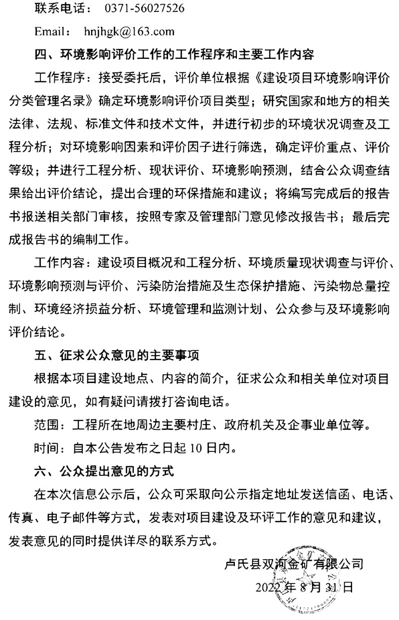 盧氏縣雙河金礦有限公司礦產(chǎn)資源開(kāi)采項(xiàng)目環(huán)境影響評(píng)價(jià)公眾參與***次公示